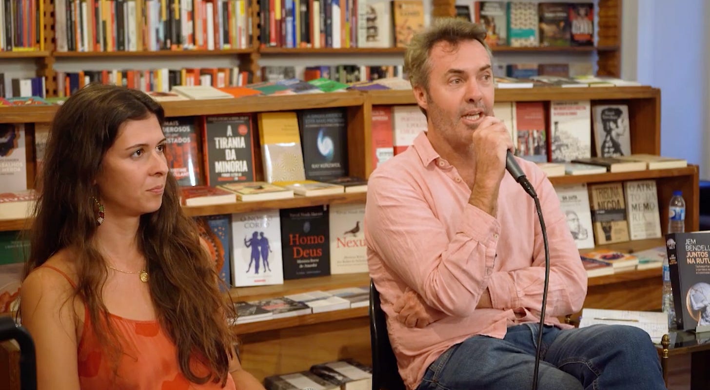 So, when I heard Jem Bendell was coming to Lisbon for the launch of the Portuguese edition of Breaking Together, I had to try to interview him. What I didn’t expect was to end up co-moderating the book launch itself, alongside researcher & activist Pedro Macedo, and the wonderful team at Bambual Portugal, the publisher responsible for bringing this book to Portuguese-speaking readers.