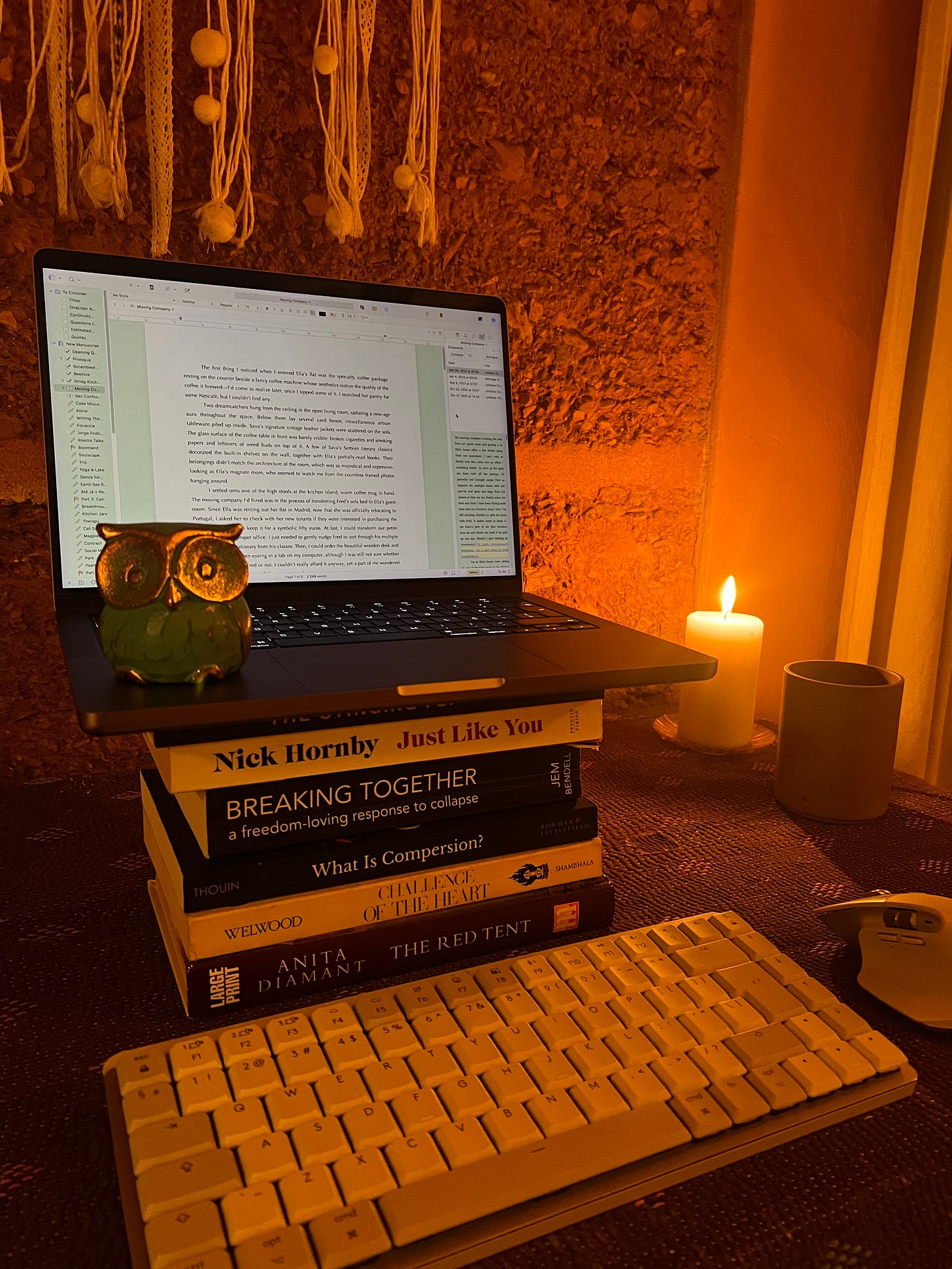 The second draft took eight months: from September 2023 to May 2024. I was more confident then: about my creative process, my vocational choices, my semi-open partnership, my identity as a writing apprentice. I began taking some freelance communication gigs, realizing that if I wanted this novel to be any good, it would probably take time. My partner encouraged me to spend some months in the Portuguese countryside, in solitude, focused, since I was privileged enough to do so. It was a good idea. After the Christmas holidays that’s what I did. I brought my favorite books and Mrs. Coruja with me (meet her in the image below). I surrounded myself with printed drafts, fluorescent highlighters, Post-it notes on the walls to keep me motivated. I spent nearly half a year like that. I wrote until one day I was finished: the day I cried rather dramatically on the grass outside, kneeling into the sunset, for I could not believe I’d crossed to the other side whole—and still partnered, still in a lovely, even better relationship, now open. I sent the manuscript to trusted writer friends, Guy James and Sophiia Dehé. I send it to an experienced editor, Jennifer Silva Redmond. I returned to the Spanish capital where I was based. I waited for feedback.
